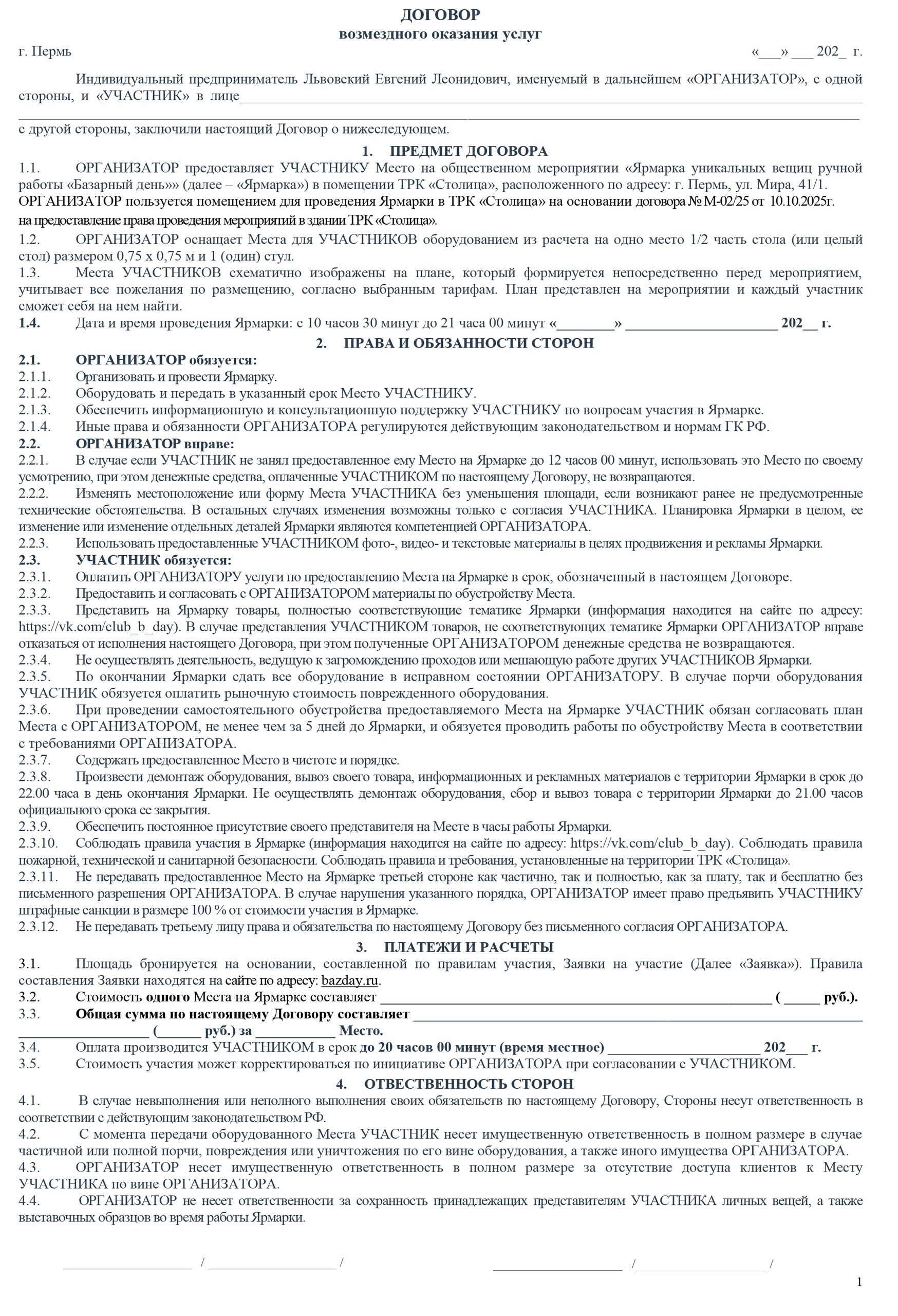 Оплата участия, подразумевает ваше согласие со всеми пунктами договора, также вы соглашаетесь и обязуетесь выполнять все правила участия в Ярмарке Базарный день. Правила участия опубликованы на нашем сайте и в группе ВK.